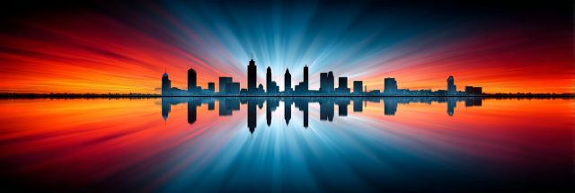 As dusk settles over the horizon, the Indianapolis skyline emerges as a breathtaking spectacle, captured here in an audacious palette that mirrors the fearless artistry found at the Burning Man festival. Each building silhouetted against the fiery backdrop is transformed into a glowing monument, shimmering in jellyfish blues and sunset oranges that bleed into each other, creating a mesmeric dance of colors on the canvas. The reflection in the serene water below doubles this visual feast, offering a perfect, undisturbed twin image that enchants the viewer, inviting them into a tranquil yet vibrant urban mirage. This composition does not merely depict a city; it evokes a festival of lights and color that celebrates the energetic essence of Indianapolis through an almost otherworldly lens. With the sky painted in broad strokes of deep reds that fade to burning oranges, and the waters reflecting a cooler spectrum dominated by ethereal blues, the artwork serves as a gateway to a realm where the normal perception of cityscapes is boldly defied and reimagined.