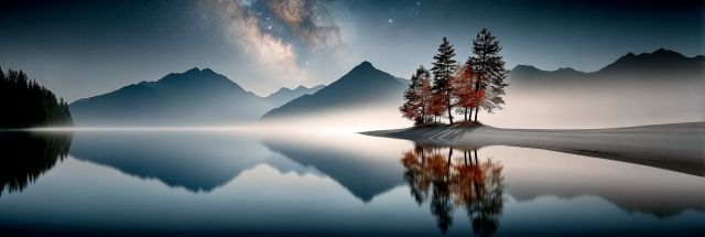 Under the celestial dome, a magnificent panorama unfolds as dusk melds into night, revealing a star-studded sky that blankets a pristine mountain lake. This artwork captures the ephemeral beauty of a universe untamed by human presence, where the Milky Way paints wisps of cosmic brilliance across the heavens. Below, the calm waters become a mirror, reflecting the constellations above and creating a double vision of the sky’s enchanting dance. On a slender peninsula, a cluster of trees, their leaves whispering secrets of the night, stand silhouetted against the distant mountains, their peaks softened by the moon’s gentle touch. This is a realm where the natural world reigns supreme, untouched and unyielding, offering a glimpse into the sublime tranquility of the night. The eerie yet soothing mist that hugs the lake adds a layer of mystique, enhancing the ethereal quality of the scene. This artwork isn’t merely a visual piece; it’s an invitation to step into a world where time slows, and nature’s majesty unfolds with every passing moment. It stirs the soul, evoking a sense of peace and wonder, a reminder of the vast, untapped beauty that lies in quiet corners of the world.