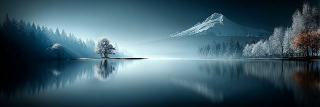 As dawn unfurls its gentle hues over Mount Hood, a serene lake mirrors the majesty of the snowcapped peak and the sleeping forest. The image, steeped in a calming blue tone, invites viewers into a moment suspended in the tranquility of Oregon's wilderness. The clarity of the reflection in the lake's glassy surface is breathtaking, encapsulating not just the mountain, but the subtle gradations of light and shadow that dance across the sky and water. Each element in this landscape—a distant peak, trees whispering in the crisp morning air, the undisturbed lake—contributes to a composition that is as meditative as it is visually splendid. As the early morning light caresses the scene, nuances of blue transition smoothly from deep navy to gentle azure, suggesting the awakening of the day. This striking panorama, with its balanced symmetry and profound stillness, offers more than just aesthetic pleasure; it provides a space for contemplation and renewal. The sparse presence of trees on the left balances the weight of the dense forest on the right, creating a harmonious visual appeal that draws the eye across every detail captured in this frame. The isolated tree in the foreground, standing resiliently alone, serves as a compelling focal point, symbolizing solitude and strength amidst the expansive natural beauty. This artwork encapsulates a pure moment of natural splendor, making visible the quiet whispers of nature that often go unnoticed.