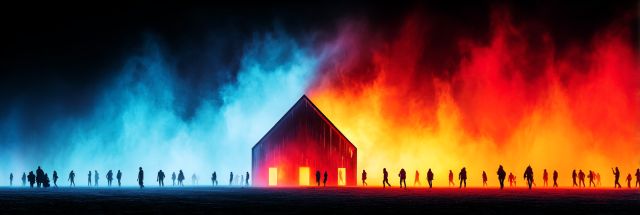 Amid the vast darkness, a lone structure emits an eerie glow, standing as a beacon for the silhouetted figures that march towards it. The scene is bathed in a surreal mixture of red and blue lights, casting a mystical haze across the landscape. This vivid representation captures the essence of a festival night where excitement and mystery linger thickly in the air. The sharp contrast of the fiery red and the calm blue illustrates a dual narrative of chaos and serenity, a commonplace in human gatherings where emotions run high. The figures, aligned in a deliberate procession, add to the drama, suggesting a collective movement towards a shared, yet unseen goal. This artwork encapsulates not only a moment of communal experience but also evokes a feeling of anticipation and the unknown. The use of light and shadow enhances the depth of the night, making the viewer feel as if they are part of this mysterious trek. The entire composition invites the onlooker to dive into a story that has just begun, with each element—the night, the figures, and the glowing barn—playing a crucial role in this visual tale.