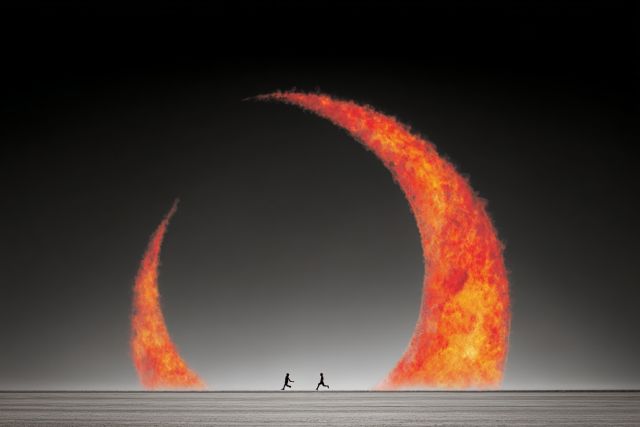 Dueling Figures under a Fiery Mobius Moon: An Artistic Revelation