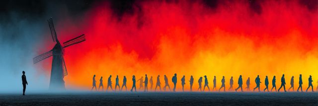 Igniting the horizon, a billowing cloud of fiery crimson and amber stretches across this canvas, evoking the vivid vibrancy of a sunset caught in an eternal blaze. In the foreground, the stark silhouette of an old windmill pierces the skyline, grounded and solemn against the tempestuous backdrop of color. A procession of figures, caught mid-march, advances under this dramatic sky, their outlines forming a striking contrast to the tumultuous hues behind them. Each figure is captured in a moment of motion, perhaps a symbolic journey or a ritualistic dance, reflecting the deep-rooted cultural narratives woven into the fabric of this scene. The juxtaposition of the timeless windmill with the dynamic human figures offers a narrative of progression and constancy, an homage to human endurance against the elements. This portrayal is not just a visual feast but also a story of resilience, community, and the undying allure of nature’s theater.