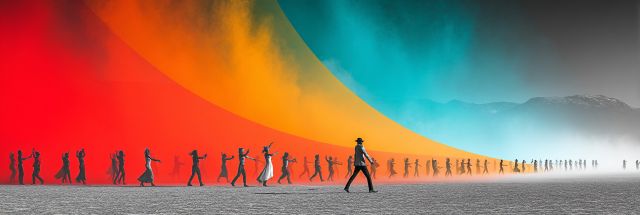 Venture into a world where the mundane meets the magnificent, where each stride celebrates the vibrancy of human expression against a starkly contrasting backdrop. In the striking panorama before you, a line of silhouetted figures dances exuberantly across a horizon that bleeds into a spectacular gradient of fiery oranges and cool blues. Each dancer, cast in dark relief, articulates a story of rhythm and unison in their fluid movements, mirroring the unspoken language of joy and rebellion inspired by the essence of Burning Man. As the coral blush of dawn gives way to the cerulean dusk, this piece encapsulates a moment of ephemeral beauty, showcasing a blend of awe and a sense of boundless freedom. This vision captures not just a scene but an emotion, resonating with the wild, untamed spirit of those who dance - unfettered and immersed in the moment. The artwork pulls the observer into a sensory ensemble of color, motion, and vitality, celebrating not only the art of movement but also the profound depths of human connection made visible by shared experiences and festive gatherings.