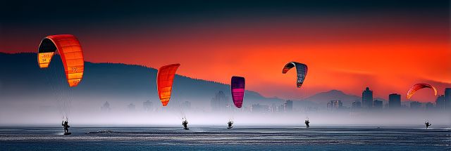 As the sun sets, setting the horizon ablaze with vivid hues of orange and pink, Buffalo's skyline forms a captivating backdrop to an enthralling scene of watersports. Kitesurfers, propelled by vibrant kites that slice through the air like colorful birds in flight, appear as strokes of brilliant color against the tranquil water. Each kite, unique in its pattern of Jellyfish-inspired designs from the famed Burning Man festival, adds a surreal and festive atmosphere to the lake's calm surface. This harmonious combination of urban silhouette and dynamic nature activity creates a visual symphony, bringing together elements of urban sophistication and adventurous spirit. Witnessing this blend of natural beauty and human artistry, the onlooker is drawn into a moment that transcends the everyday. This artwork captures the essence of Buffalo as not just a cityscape, but a vibrant stage where the beauty of nature and human creativity are in constant, delightful exhibition.