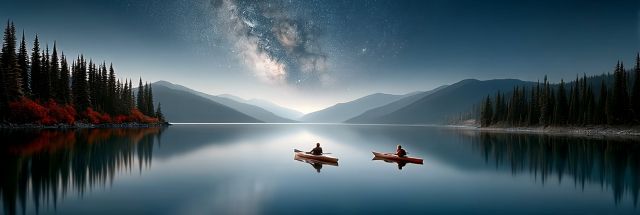 Under the vast, star-streaked skies, where the majestic Milky Way casts a silvery glow over the tranquil waters, two kayak silently glide across the mirror-like lake. Nestled in the embrace of towering pine forests and distant rolling hills bathed in the soft luminance of moonlight, this scene captures the sublime beauty of a night untouched by time. The cool, deep blue hues of the sky and the crystal waters create a dreamy and otherworldly atmosphere, inviting the viewer into a moment of pure, introspective peace. Each paddle stroke disrupts the lake's glassy surface, sending ripples across the reflections of constellations, further enhancing the ethereal quality of the scene. The kayakers, dwarfed by the grandeur of their surroundings, appear as tiny explorers traversing an infinite canvas of cosmic wonders. As the horizon gently pulls the Earth to meet the heavens, the interplay between the natural elements conjures a vast, introspective universe that calls to the adventurer in all of us. This image not only showcases the awe-inspiring beauty of a secluded wilderness night but also evokes a deep, resonant connection with the cosmos, reflecting the eternal dance between earth and sky.