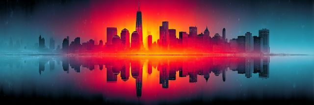 As dusk descends, New York City transforms into a fiery spectacle, casting a warm glow that contrasts starkly with the icy chill of winter. This artistic rendition captures the New York skyline engulfed in an ethereal, burning blaze, reminiscent of the fiery energy of the Burning Man Festival. The city, usually bustling with ceaseless activity, here appears serene and mesmerizing, enveloped in a soothing calm. The mirror-like reflection in the water doubles the visual impact, creating a perfect symmetry that enhances the fantastical mood. The horizon radiates a vibrant red-to-blue gradient, suggesting the last whispers of daylight surrendering to night's embrace. Iconic structures, silhouetted against the luminous backdrop, stand as silent sentinels over this transient winter wonderland. This image engages not just the sight but the imagination, evoking a sense of mystery and wonder, inviting the observer to a moment of quiet reflection in the midst of one of the world's most vibrant metropolises.