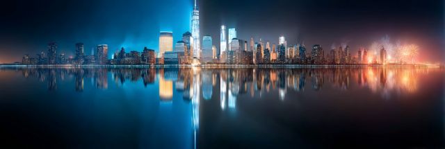 As the day's last light fades and twilight encases the city, New York’s skyline emerges not just as a silhouette against the lingering blue of the evening sky, but as a vibrant tapestry woven with the golden hues of streetlights and the sophisticated glimmer of skyscrapers. The image artfully juxtaposes the tranquil waters in the foreground with the dynamic, bustling energy embodied by the towering structures. Reflected majestically on the surface of the water, the city does not just rise—it soars. This piece is a tribute to the Fourth of July, echoing the celebratory spirit and pride that animate the city on this national holiday. The precise composition, enriched with high-definition textures and a masterful handling of natural light, offers viewers a surreal, almost sci-fi appreciation of the metropolis. It's a blend of creative photography and wild imagination, infused with elements of surrealism that transform the familiar skyline into a fantastical panorama that speaks to the soul of New York: always aspiring, always mesmerizing.