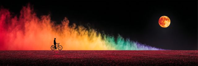 As twilight deepens, a solitary cyclist ventures across a vividly painted dreamscape, where a spectral mist of rainbow hues meets the bleeding edge of a crimson field under a grandiose blood moon. This canvas captures an ephemeral moment of surreal beauty as nature and imagination bleed together into a strikingly colorful panorama. The full moon, oversized and intense, bathes the landscape in a soft, ethereal glow, accentuating the stark silhouette of the cyclist against the multi-colored fog. This blending of fiery and cool tones, along with the sharp contrast between the dark figure and the luminous background, evokes a sense of serene motion and quiet solitude. The enigmatic scene invites the viewer to dwell in a world that straddles the delicate boundary between reality and fantasy, provoking a deep wonder about the universe's hidden layers. The artwork, capturing the spirit akin to adventures that might be whispered of at the Burning Man, mirrors the pulse of human creativity and the ceaseless quest for connection amidst the vast expanses of existence and art.
