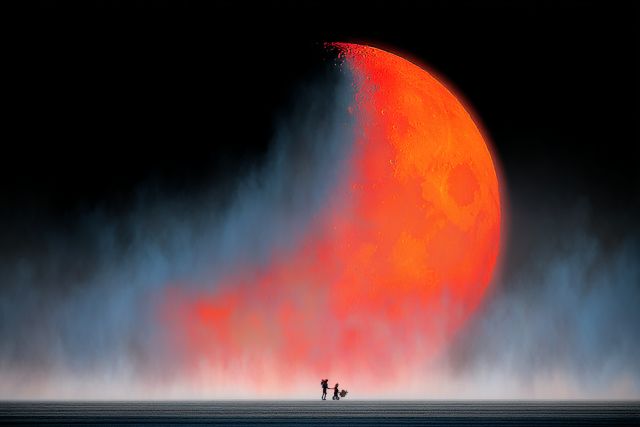 In an evocative dance of cosmic splendor, the moon and sun converge within a vibrant tapestry of celestial hues, their forms intermingling in a warm embrace that evokes the spirit of timeless unity. Bathed in a radiant glow that manifests as a vermilion spectacle against a stark, monochrome horizon, this stunning visual tableau captivates the observer with its bold contrast and profound symbolism. The vastness of the scene is punctuated by the silhouettes of two lone figures, their presence subtly underscoring the human connection to the vast wonders of the universe. This artwork, reminiscent of the fantastical themes often celebrated at the Burning Man festival, offers more than just aesthetic pleasure; it is a meditation on the harmony and eternal dance between celestial bodies. The fiery orb, detailed with nuances that suggest an almost tactile texture, appears as though it could ignite the very air around it, while the serene coolness of the moon complements this inferno with a soothing, gentle touch. This piece masterfully encapsulates the dual nature of existence—fire and calm, light and shadow, presence and absence—all woven into the fabric of the cosmos.