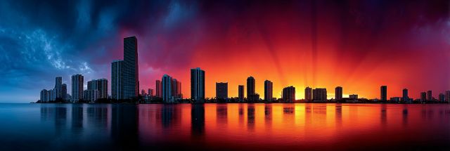 Miami Skyline at Dusk: Jellyfish Flares Over Tranquil Waters