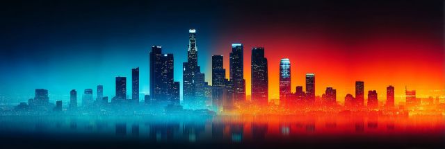 Bathed in a spectrum of fiery reds and cool blues, the Los Angeles skyline emerges as a fantastical visage, reminiscent of the vibrant scenes at the Burning Man Festival. As the city's architectural contours rise boldly against a backdrop of shimmering colors, viewers are invited into a surreal urban landscape. The fusion of iconic structures like the towering skyscrapers with the whimsical, jellyfish-like luminosity suggests a city that pulses with creativity and innovation. This artwork masterfully combines urban realism with imaginative artistry, conveying a sense of wonder and possibility. The vivid contrast between the warm and cool tones enhances the visual drama, drawing the eye across every detail of the city's famous buildings, artfully transformed into a scene that evokes the spirit of one of the desert's most iconic gatherings. The artwork’s ability to transport one from the mundane to the magical makes it a powerful statement piece, reflecting both the metropolitan might of Los Angeles and the ephemeral beauty of human gatherings like Burning Man.