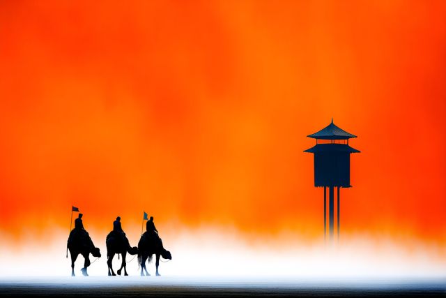 Envision wandering through a world where the surreal meets the ethereal—an art-piece that captures the essence of a fantastical realm. As the day fades, a fiery orange backdrop bursts into life, stretching across the horizon in a vivid spectacle of colors at the onset of twilight. Silhouetted against this blazing sky, three mystical riders on horseback journey towards an unknown destiny. Each horse, adorned majestically, strides confidently forward, conjuring images of ancient messengers or valiant knights from forgotten folklore. A solitary watchtower stands sentinel in the periphery, its presence adding an age-old wisdom to the scene. This poignant mingling of elements draws the viewer into a narrative steeped in mystery and enchantment. This artistic composition not only beckons to the imaginative and adventurous spirit but also whispers tales of yore where boundaries between worlds were mere veils to be traversed by the bold.