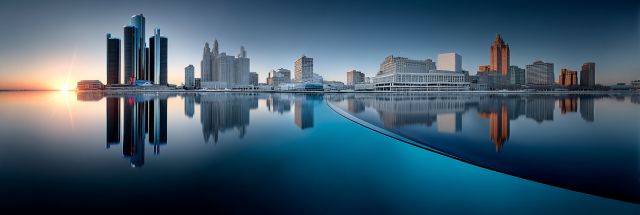 As the Fourth of July dawns, Detroit's skyline emerges resplendently under a pristine blue sky, catching the first golden rays of sunlight. The glistening waters of the Detroit River mirror the architectural marvel of the city, creating an enchanting double vision that is both serene and spectacular. Each building, from the towering glass structures to the historic steeples, is draped in the warm glow of dawn, standing as silent yet eloquent testimonies to both the city’s industrial might and its resilient spirit. This panoramic view captures the essence of Detroit, from its bustling downtown to its peaceful waterfront, in a moment of quiet celebration. With each detail crisply defined against the soft morning light, viewers are invited to traverse the cityscape with their eyes, uncovering layers of history and modernity intertwined. This image is not just a visual treat but a narrative of revival and hope, beautifully penned by nature and mankind alike, inviting the viewer to pause and revel in the tranquility and grandeur of Detroit's Independence Day morning.