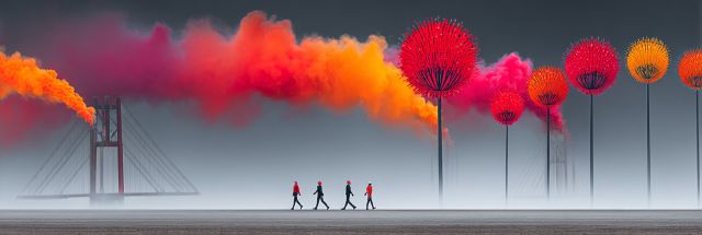 In the captivating canvas before you, a surreal landscape unfolds where the ordinary collides with the fantastical. Framed by an expansive grey void, the horizon line bears witness to an ethereal performance of color and light. Four figures, defined by their minimalistic, silhouetted form, traverse this dreamlike plane, moving toward an iconic bridge structure that anchors the composition in a reality just barely tangible. Above them, a series of striking, dandelion-like sculptures tower, erupting in plumes of fiery red and vibrant orange smoke, transforming the sky into a canvas of its own. This magnificent display blurs the boundaries between a waking dream and a fantastical reality, inviting viewers to lose themselves in the fleeting beauty of this ephemeral world. As the eye dances along the vivid streaks of color, one feels the pulsating energy of the Burning Man festival, yet in a setting stripped of its desert chaos, presented instead in a poignant, serene composition that speaks to the soul’s longing for both adventure and peace.