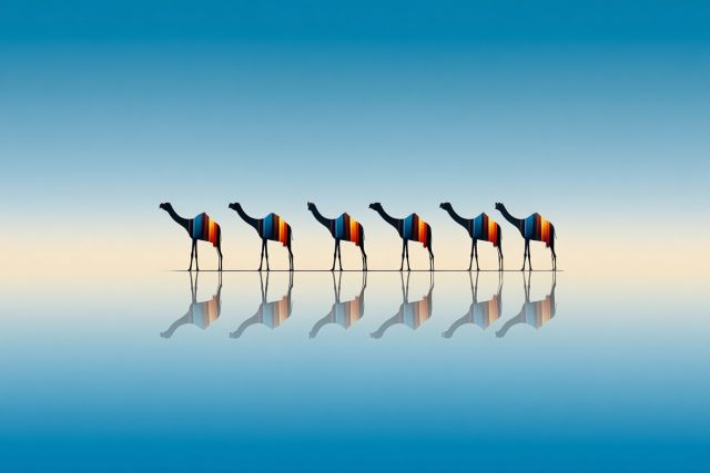 As if stepping out of a dream or an otherworldly dimension, a line of stylized horses marches tranquilly across an ethereal landscape. Each figure, rendered with sleek, minimalist lines, boasts a vibrant strip of colors across its body—reds blending into blues, and greens transitioning into earthy browns. The vivid hues contrast strikingly against the subtle blue and gray tones of the tranquil background. This artwork beguiles the viewer into a contemplative silence, mirroring the stillness of the waters below where each equine reflection gazes back with equal poise and symmetry. The composition invites interpretations rich with symbolism—perhaps a statement on diversity, unity, or the beauty of organized randomness in nature. Each element of the scene, from the placement of the horses to the intentional use of color and reflection, is crafted to evoke emotion and provoke thought, making this piece an outstanding contribution to both artistic and philosophical dialogues.