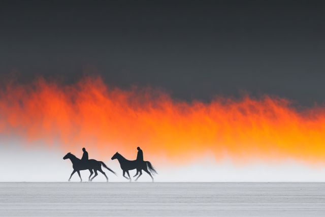 As dawn breaks, the quiet world is suddenly awash with an enigmatic transformation. A dramatic interplay of colors casts the horizon in a fierce orange glow, reminiscent of a painter’s bold strokes on a stark canvas. Amidst this fiery backdrop, three ethereal equine figures emerge, their silhouettes sharp against the soft, misty foreground. These majestic creatures, depicted in mid-gallop across an unending landscape, evoke a sense of timeless grace and wild freedom. The contrasting palette of deep grays and vibrant oranges stirs an emotional response, suggesting themes of conflict, survival, and rebirth in nature’s endless cycle. The scene is both haunting and beautiful, a glimpse into a surreal world where the natural and fantastical meld seamlessly. The horses, symbols of strength and power, carry on undisturbed by the fiery world behind them, their fluid movements a dance of shadows and light. This artwork invites viewers to pause and reflect, offering a moment of beauty suspended in time, a testament to the enduring allure of nature and its inhabitants.