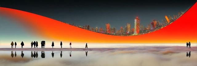 Under a sweeping arc of vivid crimson, the Mesa skyline bursts into a spectacle of light and architecture, evoking a scene that could parallel the lively celebrations of Burning Man. Each silhouette of the towering structures is bathed in a warm glow, casting reflections that dance playfully upon a dreamlike mist. This panorama, veiled by a celestial-like fog, extends a mysterious allure, inviting viewers to wander into a realm where the limitations of the everyday dissolve into the extraordinary. As figures journey across this surreal landscape, their forms are etched into the glassy surface below, establishing an intimate connection between the human spirit and the urban spectacle above.