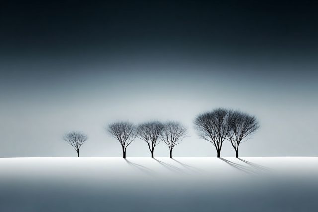 Silhouettes of Solitude: Minimalist Trees against a Stark White Horizon