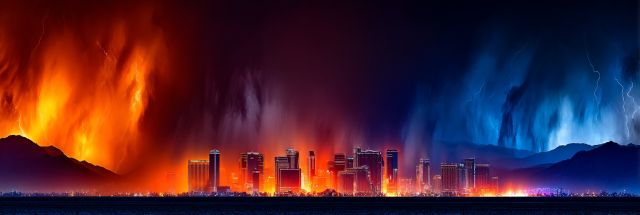 In an ethereal concoction of natural elements and urban presence, a captivating skyline sprawls beneath a surreal dance of fire and ice. The scene is set against a dark, tranquil backdrop, with mountains just visible in the shadowy distance. Dominating the landscape, the city's buildings glow as if alive, bathed in the fierce orange and red of the flames that blaze skyward on one side. Mirroring this inferno, a serene and chilling expanse of blue and white hints at a stormy tempest on the other, crackling with the electric dance of lightning. This stark contrast between fiery passion and icy composure not only highlights the volatile beauty of nature but also underscores the resilience of the urban environment against such formidable backdrops. Each element—fire, electricity, and the stoic city—comes together in a vivid tableau that is both awe-inspiring and foreboding. The imagery invokes a deep contemplation on the power of natural forces, their unpredictable manifestations, and the human creations that endure amidst such spectacles.