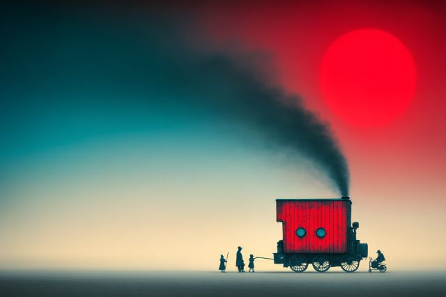 In a dreamscape that melds nostalgia with fantasy, a vibrant red railroad car embarks on an ethereal voyage across an indefinite horizon. The stark contrast between the saturated reds of the car and the vast, misty backdrop echoes a surreality reminiscent of a bygone era brought to life through a contemporary lens. Distant figures, rendered almost silhouette-like against the overwhelming expanse of an empty plain, add a human element that is both intriguing and mysterious. The plumes of dark smoke trailing from the car's chimney paint the sky with foreboding strokes, suggesting the old locomotive’s battle against the enveloping stillness. As the scenery bathes under a larger-than-life crimson sun, whose glow seeps into the land beneath, it casts an otherworldly glow that transcends time and space. This visual tale captures not just a moment but a journey— a silent narrative of adventure, isolation, and the quest for meaning amidst the vast unknown. Each element of the artwork, from the quaintly detailed car to the enigmatic figures, tells a story steeped in allegory, beckoning the viewer to pause and ponder the depths of its creation.
