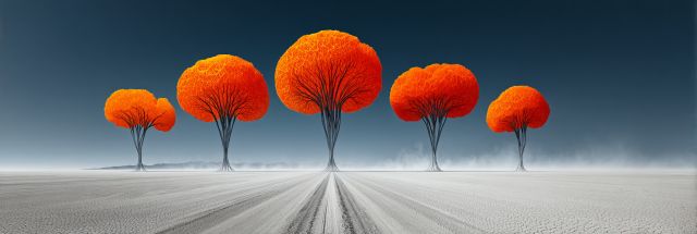 Amidst an expansive landscape bathed in the cool hues of a distant horizon, a row of striking orange trees bursts into the scene like flames from a subdued fire. Each tree, vivid and vibrant against the monochrome stretch of the wintry ground, stretches its branches upwards as if in celebration of life amidst dormancy. The surreal juxtaposition of fiery orange foliage against the icy-blue backdrop invites viewers into a fantasy, where nature defies the ordinary rules of color and climate. The effect is both dramatic and soothing, stirring a sense of wonder and serene contemplation in the beholder. The landscape, seemingly endless, punctuated by these radiant beacons of life, creates a pathway leading into the depth of the image, suggesting a journey of discovery and awe. Each tree, meticulously detailed and uniquely formed, stands as a testament to resilience and beauty, thriving in a landscape that whispers of silent frosts and frozen time. This artwork resonates deeply with those who seek beauty in the unexpected and find solace in the stark contrasts of the natural world.