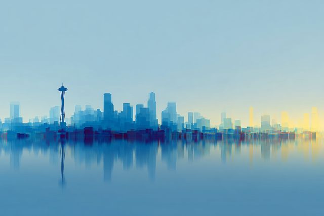 *** About [Seattle]: Seattle, a vibrant urban hub located in Washington State, is renowned for its striking cityscape which includes the Space Needle, a legacy of the 1962 World's Fair. The city's architecture, flanked by the natural beauty of both saltwater and freshwater bodies, not only provides a striking contrast to the serene waters of Puget Sound but also highlights the city's dynamic fusion of technology, arts, and nature. This artwork captures the essence of Seattle's distinctive urban beat and its reputation as a center for innovation and culture.