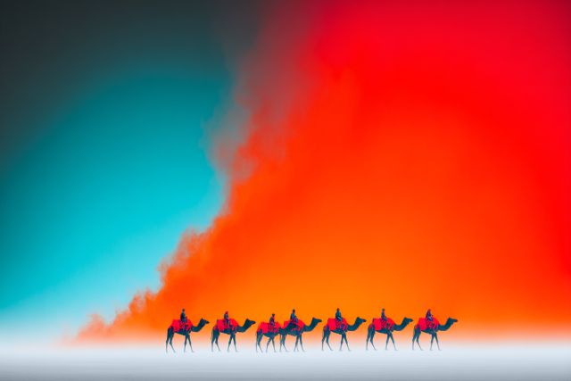 Journey Through a Spectrum: Camels Against a Vibrant Sunset