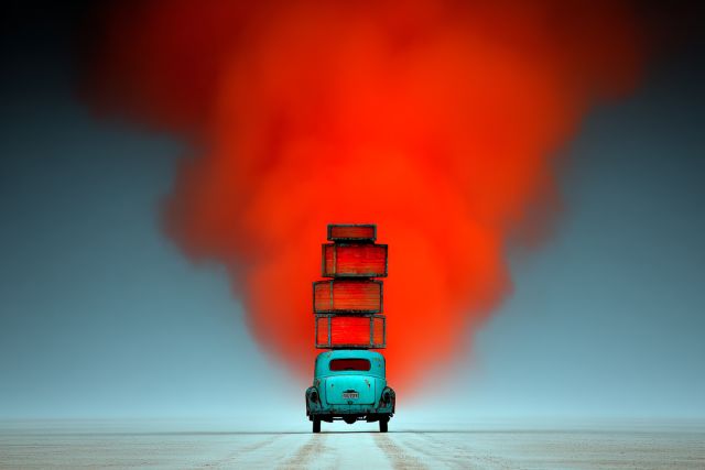 As one gazes upon the abstract yet resounding composition of this artwork, the senses are immediately captivated. A vintage blue car, bearing an ominously stacked load of glowing red crates, drives toward an unspecified yet compelling destination. The sky, an endless canvas of muted blues, serves as the backdrop to a dramatic eruption of crimson smoke that paints the horizon with fiery intensity. This surreal depiction marries the ordinary with the fantastical, creating a vivid tableau that evokes wonder and introspection. The scene could be perceived as a metaphor for life's journey — laden with challenges yet propelled forward by an unstoppable force. Each element, from the stark contrast in colors to the infinite stretch of the road, symbolizes the dynamic nature of human experiences and the resilience required to traverse them. The artwork's dramatic setting and elements inspire viewers to reflect on their paths, filled with unexpected bursts of trials and beauty. This piece is not just visual art; it's a narrative woven through colors and forms that invite endless interpretations and emotional responses.