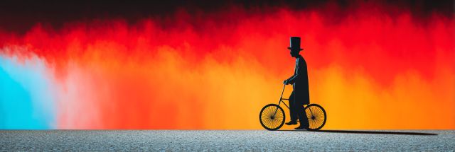 Mesmerizing Man in Top Hat Biking Against Fantasy Sunset Horizon