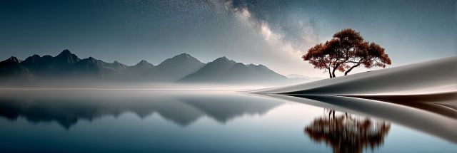 In the tranquility of an eternal night, the world takes a pause under the blanket of a brilliantly lit starry sky. This captivating scene, deeply drenched in a symphony of blues and silvers, unfolds before the viewer, inviting a moment of serene reflection. The glass-like lake mirrors the celestial grandeur above, with twinkles of starry lights dancing softly upon its still surface. Nearby, silhouetted against this cosmic backdrop, the solitary figure of a tree stands gracefully, its limbs artistically contoured with the precision of nature’s touch. Beyond this peaceful shoreside arboreal silhouette, majestic mountains rise sharply against the horizon—their peaks caressed by the gentle luminescence of moonlight, crafting a scene of soothing contrasts. This awe-inspiring landscape, with its ethereal and dreamy atmosphere, transports the onlooker to a realm where time slows and the hustle of day-to-day life fades into the distances of rolling hills and boundless skies. Shadows and highlights interact in a delicate balance, weaving a visual poetry of light that invites contemplation and inspires dreams. As you gaze into this otherworldly tableau, an overwhelming sense of calm washes over, bringing with it an unspoken reassurance of the world's quieter wonders that flourish under the cover of night.