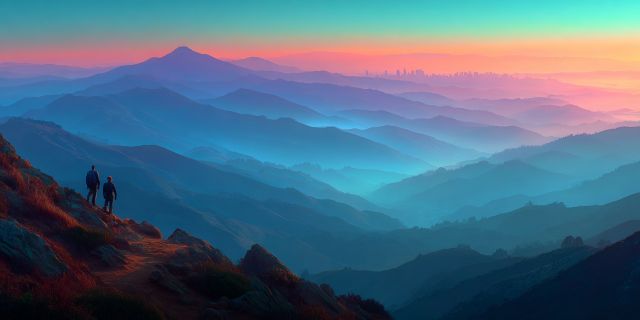 As the day breaks, a breathtaking panorama unfolds where serene dusks meet the pulsing heart of San Francisco in the far distance. Two hikers stand poised, immersed in the early morning whispers of a slumbering world awakening. The horizon blushes with hues of orange and cerulean that kiss the multi-layered silhouettes of mountains, crafting a dance of shadows and light. This scene captures the essence of tranquility and the boundless promise of a new day, fleeting yet eternal in its beauty. The peaks, wrapped in a soft fog, serve as silent sentinels over the slowly brightening city. In the foreground, the rugged terrain offers a stark contrast to the smooth, flowing lines of the distant skyline. This masterful blend of nature's grandeur and urban silhouette creates a compelling narrative of adventure and contemplation. The artwork encapsulates a moment of profound connection between man and nature, inviting the viewer to pause and reflect on the vast expanses that both divide and unite us.