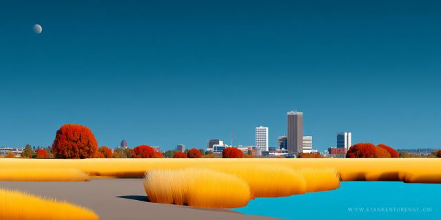 Under the clear blue skies of a warm July afternoon, the city of Stockton comes alive in an explosion of colors and light. The festive scene depicted captures Stockton's skyline bathed in the golden glow of the setting sun during the eagerly awaited Fourth of July celebrations. The foreground features whimsically oversized, vibrant orange sculptures that line meander through the park, providing a striking contrast against the azure backdrop. These abstract shapes invite the viewer’s gaze toward the urban horizon, where sleek high-rises stand proudly. Each building radiates with clarity and vibrancy, showcasing a mix of modern architectural styles. Carefully positioned in the sky, a pale moon adds a touch of tranquility to the dynamic composition. The scene is a masterful blend of natural light and artistic vision, elevating everyday urban scenery into a memorable spectacle of light, color, and imagination. This piece is not just a visual experience but an homage to the joy and unity brought forth by the Fourth of July festivities in Stockton.