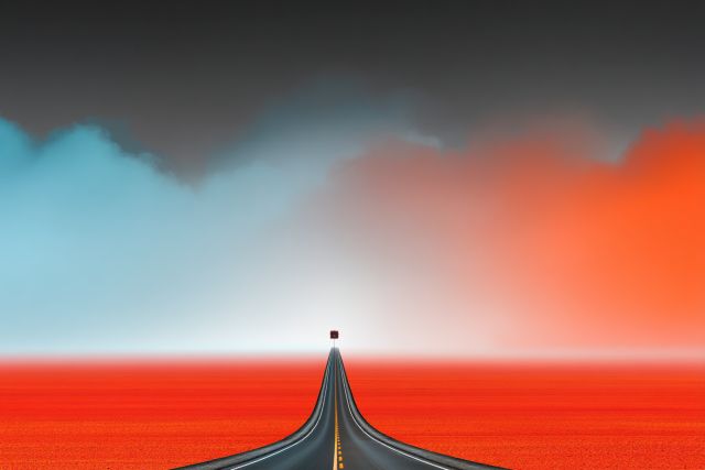 Immerse yourself in an artwork that transports you to a realm where the palpable essence of adventure and mystery beckons. The "Journey into the Infinite" presents a strikingly surreal vista, where a perfectly paved road stretches dramatically towards a horizon ablaze with fiery tones of red and orange. This visual narrative commences under an overcast sky, suggesting the calm before a storm, while the road invites one to traverse into a world suffused with vibrant, burning hues that capture the spirit of the Burning Man festival. Here, reality bends: the road symbolizes the path to transcendental experiences and discoveries. The contrasting colors evoke a deep emotional response, from the introspective blues and greys of the sky to the passionate and energetic reds engulfing the landscape. Envision yourself cruising down this lonely highway, surrounded by the intense warmth of the horizon, a vivid reminder of life’s boundless journeys and the roads we choose to travel. This art piece not only decorates a space but also invokes contemplation and wonder, making it a profound statement in any collection.