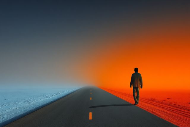 In the shimmering embrace of an endless road, a solitary man strides forward, his silhouette sharply etched against the vast, fiery embrace of the twilight. The image is a poetic synthesis of man and nature, framed by a blazing orange sky that fades into indigo at the fringes of vision, suggesting the fading light of day surrendering to the mysterious allure of the night. This vast open road, an emblem of freedom and possibility, invites the viewer to contemplate the boundless journeys that lie ahead. It captures a moment suspended between the known and the unknown, embodying the spirit of adventure and the eternal quest for discovery. With each step, the man’s journey resonates as a powerful metaphor for human aspiration, the constant pursuit of dreams amidst the backdrop of life’s immense canvas. This artwork not only beautifies the space it occupies but also serves as a constant reminder of the journeys we all must undertake, the paths we choose, and the horizons we strive to reach.