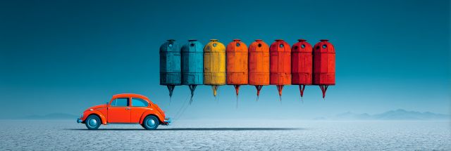 In a surreal landscape where the ordinary meets the extraordinary, a vibrant orange car stands under a big sky, dwarfed by an even grander array of fancifully colored mailboxes, suspended like balloons ready to whisk it away on an adventure. Each mailbox, dyed in vivid shades of the rainbow from deep blues to fiery reds, seems to pulse with possibility, drenched in the stark contrast of the desolate desert below. This image catches the spirit of fantasy and freedom. The scene, reminiscent of an imaginative escapade, holds viewers captive, inviting them to ponder stories of whimsical journeys and unvisited realms. Captured with crisp clarity and radiant color saturation, this artistic representation might remind one of the playful yet poignant artistry found at events like Burning Man, where the boundary between dream and reality blurs. Contrasts dominate the composition: the brilliant blue of the skyline cuts sharply against the muted tones of the flat earth, and the lone, brightly painted car juxtaposes the endless, untouched landscape it traverses. This evocative artwork stirs the soul, challenges perceptions, and speaks of the endless roads yet traveled, the tales still untold.
