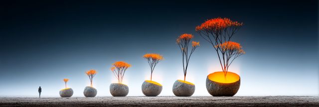In a landscape where the horizon stretches into a seemingly infinite expanse, an evocative scene unfolds that captivates and mystifies. Against a starkly contrasting blue-black sky, a series of rounded stones, reminiscent of the celebrated Lithops or 'living rocks', nestle gracefully upon the barren desert ground. Each rock, split to reveal inner hues that glow with fiery intensity, cradles a delicate tree with branches sporting vibrant orange foliage that resembles flames licking the tranquil air.