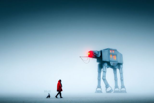 Amidst the surreal expanse of a fog-drenched horizon, a lone figure in a striking red cloak walks a small dog, both small yet vivid against the overwhelming pallor. Their journey through this ethereal landscape brings them face-to-face with an imposing mechanical behemoth. This immense construct, reminiscent of futuristic lore, stands with a stance denoting both curiosity and dominance, its eyes glowing ominously in the mist. Echoes of a distant, perhaps dystopian future resonate in this scene, where technology meets the time-honored narrative of a lone wanderer. The stark contrast of the red against the monochromatic backdrop not only captures the gaze but also evokes a cascade of emotions—loneliness, resilience, and the indefatigable human spirit facing the gargantuan forces of man-made marvels. As the mist swirls, it casts a dreamlike quality over the tableau, blurring the lines between reality and fantastical imaginings. This artwork invokes a profound narrative on coexistence and confrontation between humanity, its creations, and the natural environment engulfing them.
