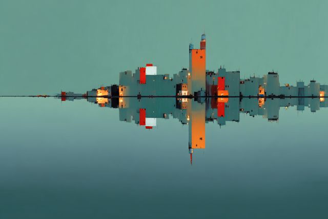 Bathed in the tranquil hues of soft sage green, the Los Angeles skyline melds seamlessly into its own reflection, forging a surreal and mesmerizing tableau. The distinctly urban silhouette of this famous metropolis is transformed into a soft-focus panorama, where sharp architectural lines dissolve into the glassy waters below. As daylight wanes, pockets of warmth from windows and streetlights pierce through the soothing green, suggesting life within this serene, dream-like cityscape. This artwork captures a moment of pure calm, an unexpected stillness in the bustling city life. The scene is a testament to the power of abstract expressionism, turning a familiar cityscape into a stunning visual meditation. The viewer is drawn into a contemplative state, encouraged to ponder the fluid borders between urban reality and reflective illusion. As much a philosophical journey as it is a visual delight, this piece encourages introspection and calm, making it a perfect statement in any environment that values depth and tranquility in its aesthetic.