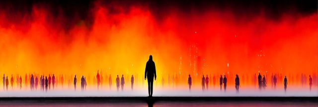 Enveloped in a majestic play of radiant hues, this canvas embodies a stirring panorama of expressive silhouettes against a backdrop steeped in flame-like vibrancy. The mise en scène unfolds under an ethereal skyline, narrating a surreal interaction between man and the enigmatic forces of nature. Each silhouette, a distinct echo of human presence, stands caught between the ordinary and the otherworldly, creating a poignant contrast with the fiery horizon. The shimmering essence of this visual expanse hints at stories untold and spirits soaring high amidst the overwhelming rush of colors that dance across the canvas like flickering flames. These flames, swirling in hues of deep oranges, vehement reds, and soothing yellows, engage the viewers, beckoning them into the depths of its inferno.