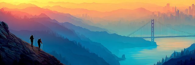 As dawn unfurls over the horizon, the warmth of the rising sun bathes the San Francisco skyline in a golden hue, casting long shadows that dance silently across an undulating landscape. In the foreground, two silhouetted figures stand poised on a rugged mountaintop, absorbed by the panoramic view stretching endlessly before them. This breathtaking scene encapsulates both the serene solitude of nature and the vibrant pulse of urban life. The majestic Golden Gate Bridge, a feat of architectural brilliance, spans the cool blues of the bay, linking the lush wilds to the bustling city. This artisanal portrayal uses a palette of rich earth tones and muted pastels to create a soothing, yet stimulating visual experience. The geometric abstraction adds a modern twist to the natural landscape, making it a perfect representation of merging worlds—at once timeless and contemporary. A mystical mist hovers over the mountains, adding a layer of mystery and enchantment to the vista. This artwork invites viewers to pause and reflect on the beauty of contrasts—the gentle quiet of nature juxtaposed with the dynamic energy of one of America's most iconic cities.