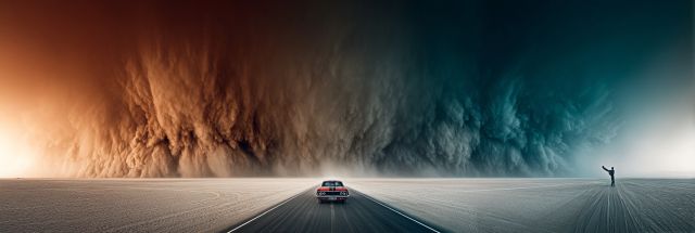 Suspended on an endless expanse of tawny desert, a lone figure and a vintage car stand defiant against a breathtaking spectacle of nature's dual disposition. The horizon bends under the colossal weight of a dust storm, its massive clouds rolling in a powerful dance of shadow and light. Here, the elements converge in a symphony of contrasts: the fiery rage of the storm ignites the calm, cerulean sky, while the cool, embracing hues of twilight soothe the fiery undercurrent. This visualization is an ode to resilience, a stark portrayal of humanity's enduring spirit against the overwhelming forces of nature. The scene is surreal, almost cinematic, as if plucked from a tale of exploration and survival. With every grain of sand caught in the tempest’s embrace, viewers are invited to ponder their own journeys through the chaotic storms of life. This artwork encapsulates more than a moment—it captures a narrative of epic proportions, fostering a connection with all who dare to gaze upon its intrinsic beauty and terrifying power.