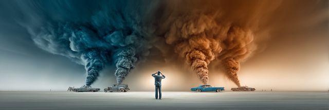 Under a cataclysmic sky, time warps into a visual symphony where the past collides with an apocalyptic present. The scene, bathed in the eerie glow of twilight, portrays a solitary figure, dwarfed by the colossal, swirling smoke plumes erupting from a series of vintage vehicles. Each car, wreathed in its own dark, billowing storm, appears anchored in a moment that straddles the line between motion and stasis. A palpable sense of urgency emanates from the image as the man, peering through his camera, attempts to capture the inexplicable spectacle before him. The stark, barren landscape stretches into infinity, its void interrupted only by the surreal procession of cars, each contributing to the ominously beautiful chaos that dominates this terrain.