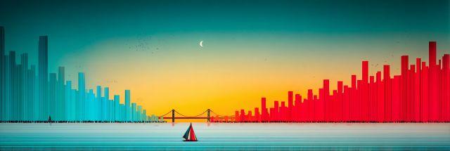 As the day folds into the quiet cool of twilight, San Francisco's skyline erupts in a radiant display of fiery reds and cool blues. Captured in the style reminiscent of Burning Man's eclectic artistry, this canvas invites viewers on a serene journey through one of the world's most iconic cityscapes. A solitary sailboat glides across the tranquil waters, a stark yet harmonious contrast to the bustling city vibes. The skyline, portrayed in a spectrum spanning from icy blues representative of the calm morning to intense reds mimicking the passionate evening sky, stitches a tapestry of time and mood. Overhead, a slender crescent moon hangs subtly, a gentle reminder of the ever-present watchful evening. The commodious sweep of the Golden Gate Bridge stretches across the horizon, bridging the gap between reality and fantastical interpretation. This artwork doesn't just depict a city; it narrates a day's passage, encapsulating the soul of San Francisco through colors and contours that dance vividly, whispering stories of the urban heart and the wild spirit of cultural festivities.