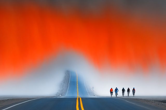 Fiery Skies and Frosty Paths: Cyclists Conquer Surreal Landscape