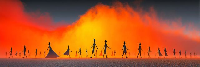 Enveloped in a fiery embrace of sunset hues, a line of elongated silhouettes casts a spellbinding procession across a barren landscape. This visual feast captures the essence of a festival akin to the famed Burning Man, where artistry and the human spirit dance under the open sky. Each figure, distinct yet unified with the others, parades towards a central, majestic tent that anchors the scene—an oasis of camaraderie and creativity in the stark expanse. The intense orange and red backdrop suggests a world that vibrates with energy and the indomitable spirit of festival-goers who come together to celebrate life’s ephemeral beauty. The composition leverages powerful contrasts and stark minimalism to evoke deep emotions—loneliness juxtaposed with community, stillness with movement, the bleak with the vibrant. This is a canvas that does more than decorate a room; it ignites the imagination and serves as a continual source of inspiration, reflecting the overwhelming passion and transformative experience of shared human experiences in surreal settings.