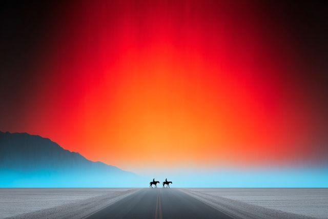 As dawn breaks, a fiery swath of red bleeds into the turquoise canvas of the pre-dawn sky, setting a blaze across the horizon. Beneath this spectacle, the desert stretches endlessly, its vast grit paved into a long, desolate road that slices through the landscape. In the distance, silhouetted against the intense colors of the firmament, the graceful forms of two riders on horseback advance, their existence almost ethereal against the stark, foreboding environment. This image evokes a surreal, vivid journey, resembling the landscapes of dreams more than the realm of waking reality. The contrasting colors create a potent visual polarity, dancing between the warmth of the fiery sky and the cool shadow of the ground. This artwork, provocative and intense, lures the viewer into contemplation of vastness and solitude — elements often explored in artistic expressions of freedom and escape. Laden with symbolism, the image invites interpretations of journey, partnership, contrast between the fiery and serene, and the blur between reality and fantasy.