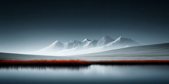 With perfection reflected in still waters, a mesmerizing panorama unfolds beneath a vibrant autumn sky. Snow-capped peaks rise majestically in the distance, their white crests cutting a stark contrast against the deep azure above. The mountain range, enveloped in a tranquility that only nature can devise, stands sentinel over the surrounding expanse. Below, the landscape transforms into a tapestry of autumn hues; green grasslands give way to an endless wet meadow, vibrantly draped in fiery red mosses that seem to burn with life. This scene, set in a serene mirror-like lake, encapsulates a moment of pure wilderness magic. The waters, undisturbed by even the gentlest breeze, reflect the spectacle above, doubling the beauty in a symmetrical showcase that blurs the line between reality and reflection. The foreground of the image, lush and richly detailed, invites the observer to step into a world where nature dictates majestic beauty and infinite calm. This serene tableau, enhanced by the soft glow of sunlight, offers a visual feast that speaks to the soul’s longing for peace and natural beauty. It is a testament to the enduring allure of untamed wilderness captured through the lens of a high-resolution camera, where every detail is meticulously color-graded and retouched to convey the crisp essence of professional outdoor photography.