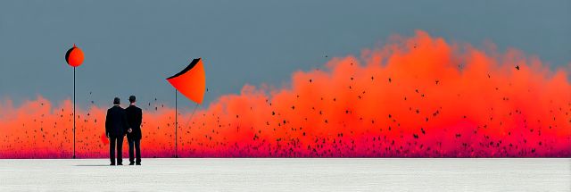As if painted with the vibrant hues of an ever-changing canvas, this artistry captures a moment suspended between the surreal and the magnificent. Drenched in the fiery shades of a sunset, the backdrop resembles a storm of rose and tangerine petals, evoking the spirit and irrepressible joy of the Burning Man festival. Against this vivid sea, two silhouettes stand poised, sharing a moment of connection that transcends the ordinary. On the left, a balloon stretches toward the heavens, a symbol of whimsy and the fleeting nature of beauty, while to the right, a flag billows—a declaration of presence and celebration. This composition is a dance of elements and emotions, a visual symphony that speaks to the heart of human gatherings and the shared experiences that define and enrich our lives. Beyond mere decoration, it invites the viewer to ponder the depths of human connections framed by the limitless sky and the raw, elemental beauty of the world around us.