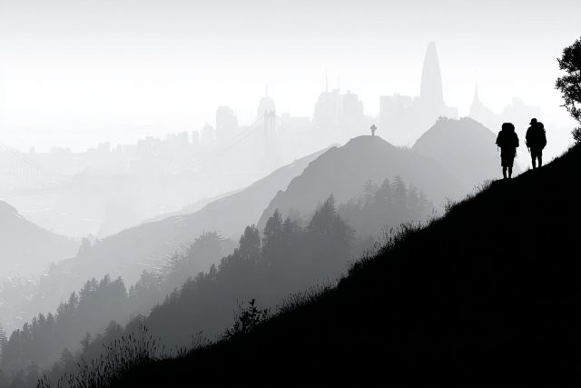 As the crisp morning air brushes against the cheeks of two adventurous souls, a scene of tranquil majesty unfolds beneath the soft hues of dawn. These determined hikers, silhouetted against the subdued light, pause on a rugged hillside, gazing out over a city that stretches lazily into the horizon. San Francisco, with its iconic high-rises and landmarks, appears as a silhouette through a misty veil, creating a dreamscape that merges urban pulse with the natural serenity of the surrounding landscapes. This is not just a vista; it is a moment of human connection with the vast stage of life and civilization. The city’s notable structures, like the spear-like Transamerica Pyramid, peek through the fog, symbolizing the city's aspirations reaching skywards. Below, the dendritic patterns of tree-lined ridges and paths draw the eye, inviting contemplation of the varied textures that compose Earth and humanity’s habitats. As the morning light grows stronger, the contours of the city become more defined, signaling the start of a new day and the continuous cycle of urban and natural life. This artwork captures not just a powerful visual narrative but also echoes the resonant pulse of one of America’s bustling hubs, encapsulated in a moment of quiet.