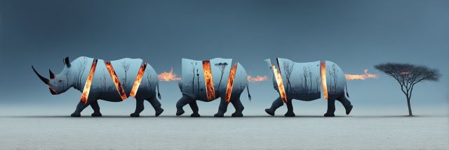Venture into the surreal as rhinos, each emblazoned with fiery silhouettes of trees and golden skies, march across a stark, pale terrain under a subdued sky. This captivating scene merges the wild majesty of nature with an imaginative twist that evokes the whimsical ambiance of a festival. The creatures, rugged and enduring, represent the untamed spirit of wildlife, each step resonating with the power and mystery of nature intertwined with human creativity. As dusk falls over this desolate yet beautiful landscape, the horizon burns with a quiet intensity that mirrors the burning strips on the majestic rhinos. This artwork not only captures the eye but also ignites the imagination, bridging the gap between the possible and the fantastical. It’s a visual ode to the spirit of the wild, tamed only by the confines of the canvas, urging the viewer to delve deeper into the realms where reality dances with illusion.